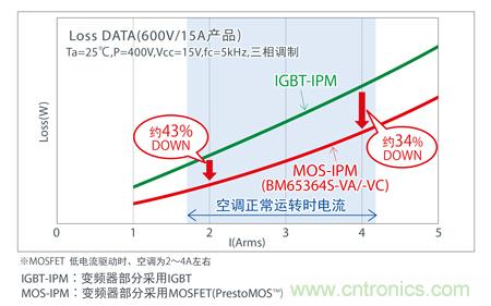 一般MOSFET具有在高速开关条件下和低电流范围内的导通损耗较低的优势,具有降低设备正常运转时的功耗的效果。通过开发出可支持大电流的MOS-IPM,可使设备正常运转时更加节能。