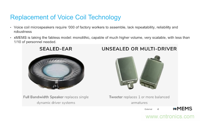 xMEMS是一家新成立的公司,成立于2017年,总部位于加州圣克拉拉,在台湾设有分公司。到目前为止,该公司一直处于隐身模式,直到今天才公开发布任何产品。据悉,该公司的动机是利用创始人多年来在不同MEMS设计公司积累的丰富经验,打破数十年来的扬声器技术壁垒,用全新的创新纯硅解决方案重塑声音。
