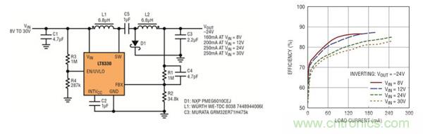 图 6:8V ~ 30V 输入转换至 –24V 输出的 Cuk 转换器及其效率