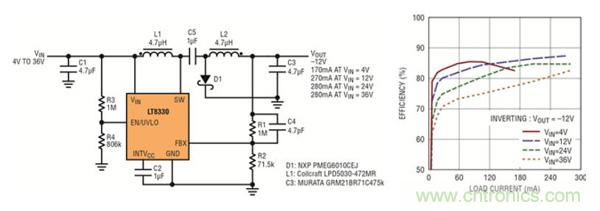 图 7:4V ~ 36V 输入转换至 –12V 输出的 Cuk 转换器及其效率