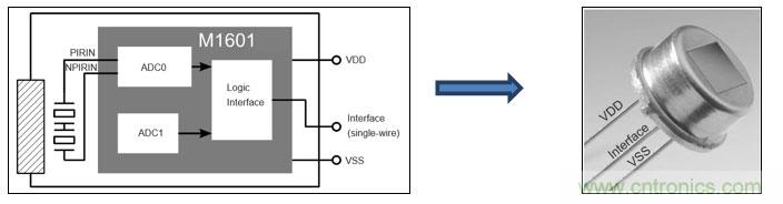 M1601芯片和热释电敏感元直接连接 用户采用M1601芯片得到PIR数字探头