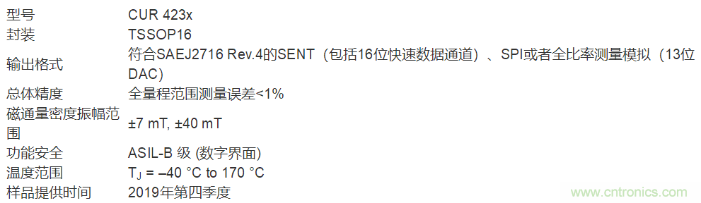 磁通量密度范围可以是±7 mT 或者±40 mT 。磁场范围可精调,支持不同应用的电流范围。装有CUR 423x的电流传感模块可以在生产过程中通过输出管脚进行编程。用户可以自行选择输出界面,比如符合SAEJ2716 Rev.4的SENT、SPI或者全比率测量模拟,以灵活适应各种应用的要求。