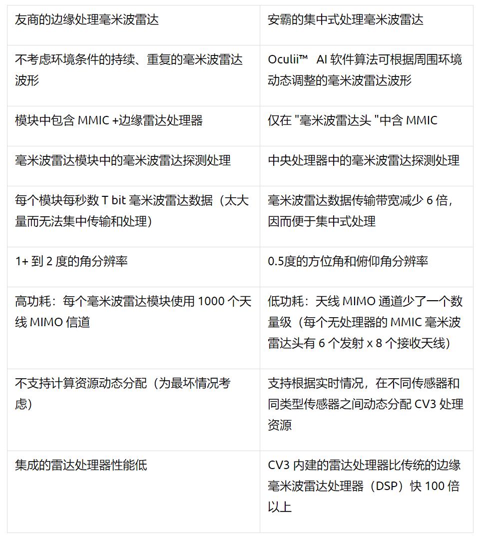 新款集中式架构的优势还包括更容易进行 OTA 软件升级,以便未来不断改进和适应新需求。相比之下,在确定每个模块使用的处理器和操作系统之后,每个边缘毫米波雷达模块的处理器必须单独更新;而单一的 OTA 更新可以直接推送到 CV3 主芯片,并在系统的所有雷达头中汇总。这些雷达头只需要雷达收发芯片 而不需要雷达处理器,这就降低了前装的成本,以及在发生事故后更换的材料成本(大多数毫米波雷达位于车辆的保险杠后面)。对比新一代集中式毫米波雷达软件更新的便利,由于传统的分布式雷达更新软件比较复杂,如今部署的许多毫米波雷达模块从未更新过软件。
