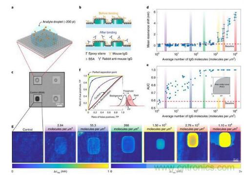 当光线照射到超表面上并击中其中一个热点上的某个分子时,分子会被立即检测出来。实际上,分子是通过改变照射光线的波长,暴露了自己。通过采用超表面上不同颜色的光线,并每次通过CMOS摄像头拍照,研究人员们可以计算出样本中分子的数量,并精准地学习到传感器芯片上正在发生什么。论文第一作者 Filiz Yesilkoy 表示:“然后,我们采用智能数据科学工具分析通过这个过程获取到的几百万个CMOS像素点,并判断趋势。我们已经展示了我们能对热点上单独的生物分子,甚至是只有单个原子厚度的单层石墨烯薄片,进行检测和成像。”