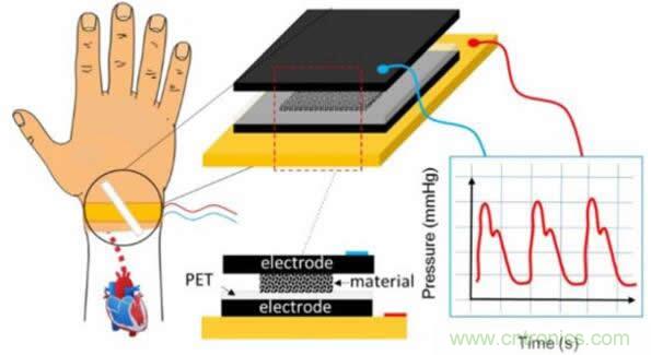 将这种电容式压力传感器安装在受试者手腕上,可记录动脉脉搏的压力变化,提供实时且原位的电容读数