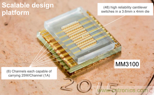 该MEMS开关具有低功耗的优点,使其得以因应大电流的开关任务。此外,它并不像传统的电源开关或继电器一样发热,因而不必采用大型且昂贵的散热片。