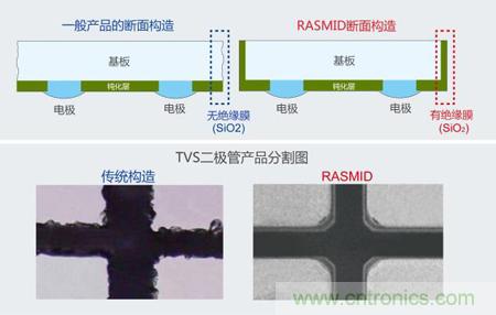 为延长电池的使用寿命,近年来,对低压电路的需求日益高涨。要实现小型化且要降低直接连接低压电路的反向工作电压,抑制泄漏电流一直是需要攻克的难题。此次开发的RASMID系列的TVS二极管,融合了齐纳击穿和双极技术,同时实现了低泄漏电流和低电压。反向工作电压(VRWM)达3.3V,非常有助于设备进一步节省电力。