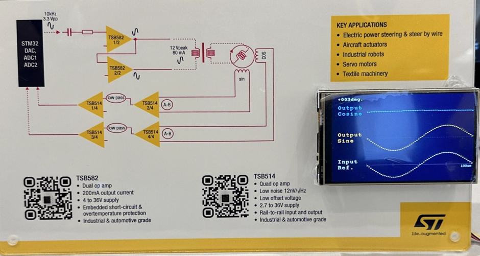 TSB582是意法半导体首款高压大电流双运算放大器,封装小巧(带裸露焊盘的SO8和带有裸露焊盘和表面可湿的DFN8)。我们的团队首先考虑将其用于电动车辆的旋转变压器,或具有高功率交流电机或无刷直流电机的其他应用(能将机械运动转换为电气数据),以确定电机位置并提高效率。此外,该运算放大器的尺寸以及与其他运算放大器的引脚兼容性使其成为一款出色的压电执行器通用器件。因此,我们在2023年全球嵌入式系统展上推出了TSB582并在驾驶模拟演示中展示了新款Toronto Technology Tour。
