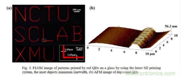 由于备的每个RGB子像素的尺寸仅为3 μm * 10 μm,因此在小面积上实现量子点材料的精确喷涂也是该研究的一大亮点所在。该研究团队所采用的高精度量子点喷涂技术,可实现1.65 μm线宽的均匀喷涂(如图所示),喷涂精度可以很好地满足要求。