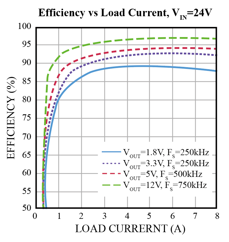 凭借先进的集成技术与卓越的封装工艺,艾诺半导体EZ8826和EZ8836的峰值效率能够达到 96%以上。同时,其特殊的封装材料与形式,一方面有效减小了整体方案的尺寸,另一方面还起到了均匀温升的作用,进而提高了整体的效率和可靠性。不同输入输出电压下的效率数据可参考下图2和图3。
