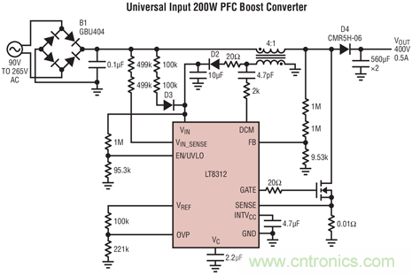 【导读】Linear 推出升压型功率因数校正 (PFC) 控制器 LT8312,该器件通过主动调制输入电流,可实现高于 0.99 的功率因数,从而符合大多数谐波电流辐射要求,适用于工业和航空应用。