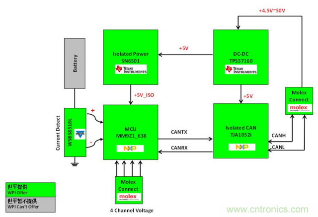 该解决方案采用NXP MM9Z1_638为主控芯片:MM9Z1_638是一个全面集成的电池监控器件,该器件可通过一个外部分流电阻进行精确电流测量,可通过使用内部校准电阻分频器或外部分频器提供4路电压测量,其包括一个内部温度传感器,可贴紧电池并测量电池温度,外加4个外部温度传感器输入。MM9Z1_638包括LIN 2.2协议和物理接口以及一个MSCAN协议控制器,可通过外接一个CAN接口芯片与汽车总线连接。