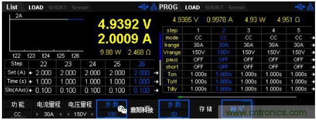 通过编辑单步的设置值、持续时间和斜率(仅CC模式下),List功能可以生成多种复杂的序列,以满足复杂的测试需求。List功能支持100步编辑,program功能支持50组程序编程。