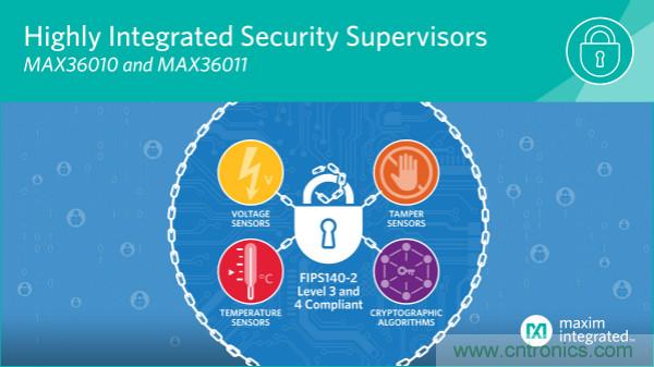 MAX36010和MAX36011均提供强大的安全性,可以在任何开发阶段轻松整合到设计之中。此外,如果在设计周期后期集成该器件,也无需更换平台,大大简化了开发过程。这些器件凭借高集成度,将设计周期缩短60%、材料清单(BOM)成本降低20%。为确保更高等级的安全性,这些监控器通过真随机数发生器(TRNG)产生密钥,随后将密钥与证书及其他敏感数据一起存储在电池供电的RAM中。器件满足美国联邦信息处理标准(FIPS) 140-2最高安全等级要求(3级和4级),即检测到篡改时立即擦除数据。