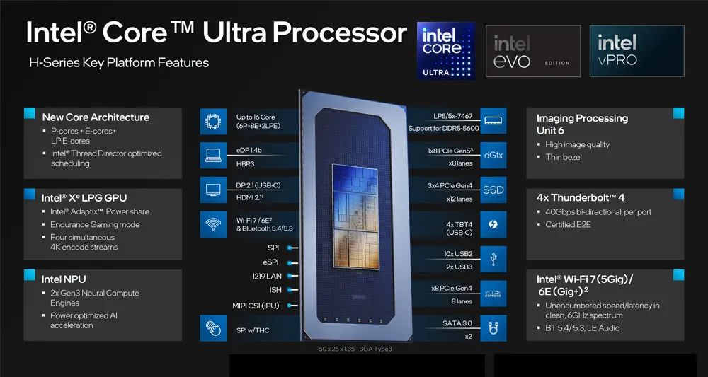 UT1003AW主板采用Intel 全新一代酷睿 Ultra处理器,支持U和H两个系列,基础功耗分别为15W和28W。U系列为2核心(性能P)+8核心(效率E)+2内核(低功耗LP-E)规格,最高4Xe核显。H系列最高6核心(性能P)+8核心(效率E)+2内核(低功耗LP-E)规格,最高8 Xe核显, 最高拥有高达5.1GHz的增强时钟以及内置的Arc GPU, 8个Xe内核运行频率高达2.35GHz。Ultra处理器首次集成AI加速器“神经网络处理单元(NPU)”,大幅缩短了模型推理响应时间,将高能效AI加速提升到了新的高度,带来2.5倍于上一代产品的能效表现,新的Xe LPG架构允许在更低的最低电压下提高性能,并且还增加了对英特尔XeSS升级技术和光线追踪的支持。