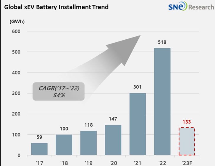 5月3日,动力电池分析机构SNE Research发布报告,2023 年 1月至3 月,全球车辆注册电动汽车(EV,PHEV、HEV)电池总使用量约为133GWh,同比增长38.6%。 中国的比亚迪同比增长2倍以上,超越LG新能源位居第二,仅次于宁德时代。
