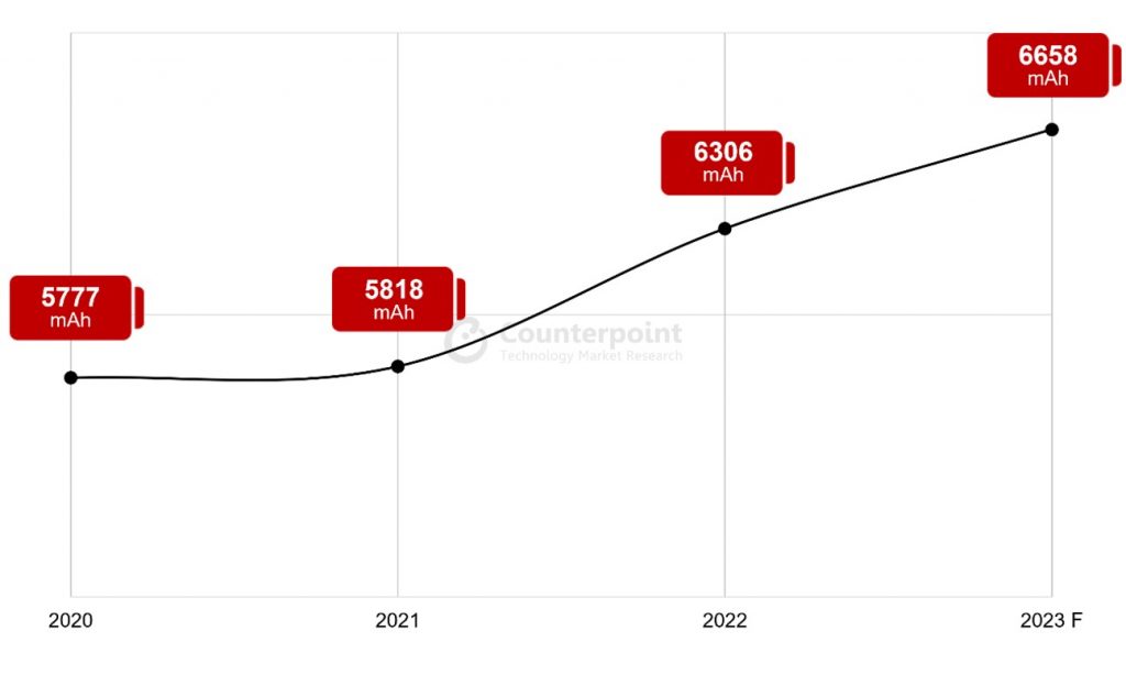 除了屏幕尺寸的变化,平板电脑的电池容量也在不断增长,这保证了更大尺寸显示屏的供电,同时也有助于性能提升。2020年,平板电脑的平均电池容量为5777mAh,预计2023年可以达到6658mAh。