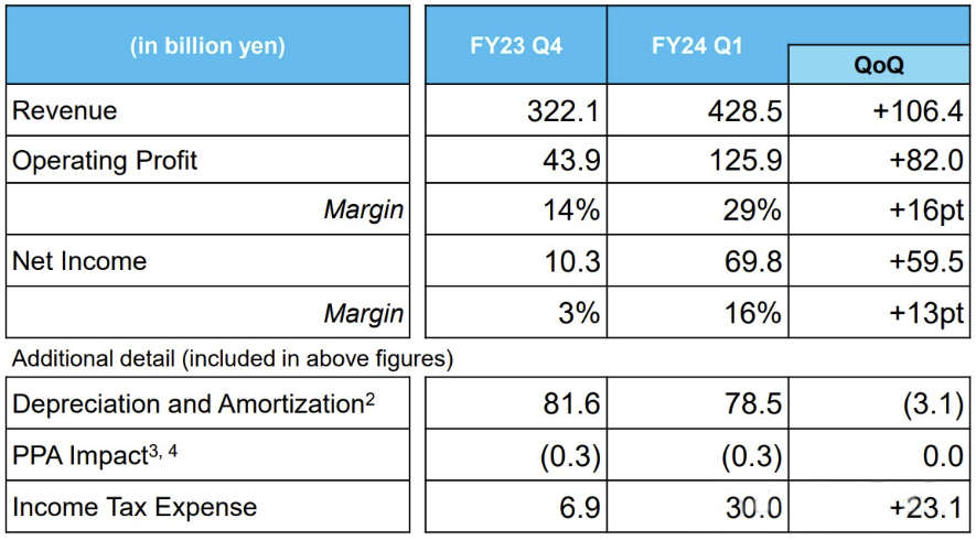 【导读】日本NAND Flash大厂铠侠公布了2024财年第一财季(2024自然年二季度)财报,合并营收同比暴涨71%、环比暴涨106.4%至4,285亿日元,连续第二季呈现增长、季度营收也创下历史新高纪录。