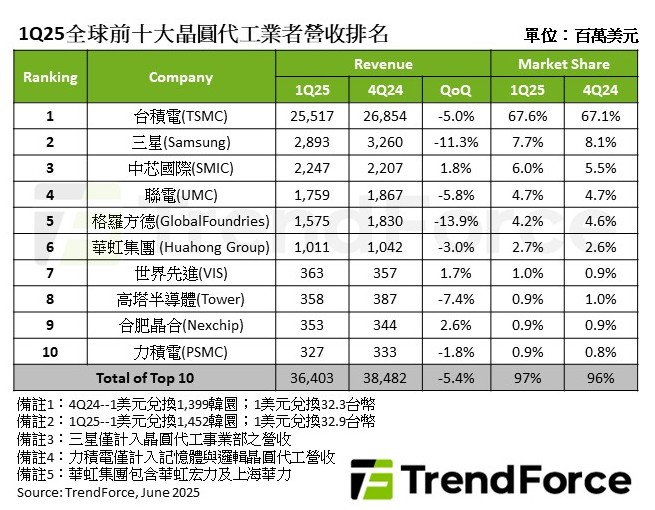 全球晶圆代工市场在2025年一季度迎来戏剧性开局。市调机构TrendForce最新数据显示,尽管行业整体营收环比下滑5.4%至364亿美元,但地缘政治博弈与产业政策红利交织下的结构性机会已然显现:台积电以67.6%的市占率持续碾压竞争对手,中芯国际凭借关税避险订单与大陆消费补贴政策,营收逆势增长1.8%至22.5亿美元,连续第三个季度稳居全球第三。在这场由AI算力需求与关税政策共同导演的产业变局中,头部厂商的排位战正衍生出全新叙事。