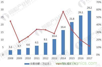 图表3:2008-2017年中国电子商务交易总额及增长率(单位:万亿元,%)
