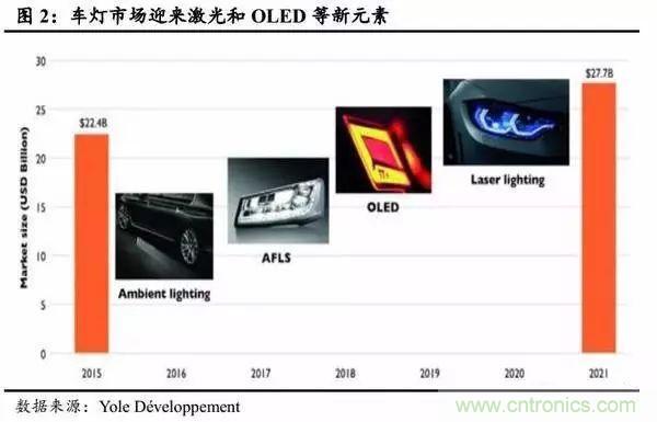 另外,Yole市场调研报告称,2020年全球汽车照明市场规模大约为270亿美元,由此估算,届时激光车灯产值占汽车照明市场约8%。考虑到激光车灯单价远高于其他类型,渗透率大约为5%,可见该行业的前景相当广阔。