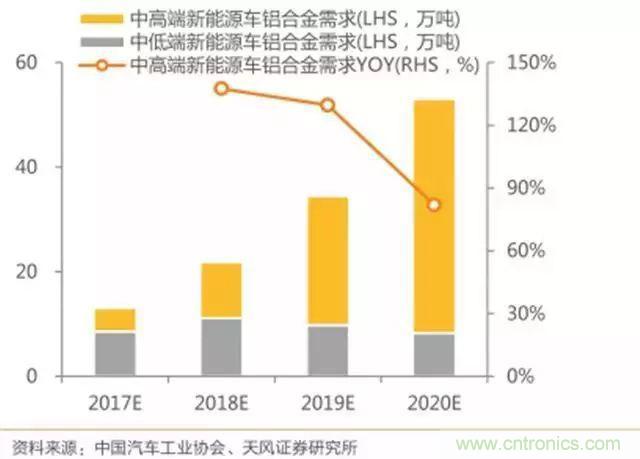 天风证券以中低端、中高端新能源乘用车分别 200kg、350kg 平均单车铝合金零部件使用量来计,则 2020 年中低端、中高端新能源乘用车行业铝合金零部件需求量将分别达到 8.3 万吨、44.7 万吨。其中,中高端新能源乘用车铝合金零部件需求 2018-2020 年CAGR 高达 114.9%。