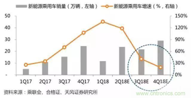 中国2017-2018季度新能源汽车产销测算(万辆,%)