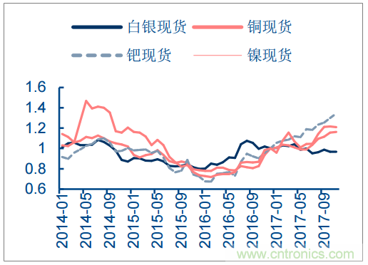 原料价格全面上涨,总体成本上浮15%。2017年,陶瓷电容的原料价格全面上涨,其中,陶瓷粉价格上涨10%-15%,电极材料价格上涨15%,包装材料价格上涨17%。此外根据近年来制造业人员平均工资的变化趋势来看,17年制造业人工成本涨幅约为15%。综合来看,2017年全年陶瓷电容产品成本涨幅约为15%,相对MLCC产品价格30%的涨幅而言,这一上涨较为温和。受此影响,电容厂商毛利空间扩大。展望未来,受到国际大宗商品价格回调等因素的影响,电极材料价格增长放缓,我们预计短期成本大幅上升的可能性不大。在终端陶瓷电容价格上涨的背景之下,电容厂商盈利空间或将进一步扩大。
