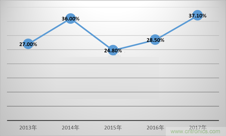 我国LED产业起步于封装阶段,芯片在早期主要依赖进口。近年来,在LED照明等下游产业的快速发展,国外主要LED芯片厂商扩产趋于谨慎、供给增长出现紧张以及国内各地方政府的政策支持下,三安光电、澳洋顺昌、华灿光电等中国LED芯片厂商加大研发投入,依靠资金、规模等优势相继扩产,国内LED芯片行业快速发展,全球LED芯片产能逐渐向中国大陆转移。目前中国LED芯片的全球市场份额从2013年的27.00%提升至2017年的37.10%。