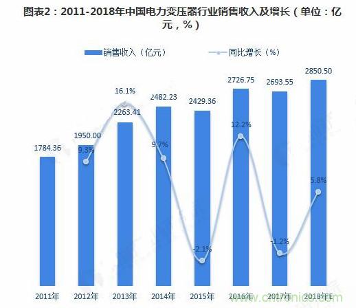 2011-2017年,电力变压器行业的销售规模不断扩大。2017年,电力变压器销售收入维持在2700亿元左右,达到2693.55亿元,同比下降1.22%;据前瞻产业研究院测算,2018年销售收入预计在2850.50亿元。