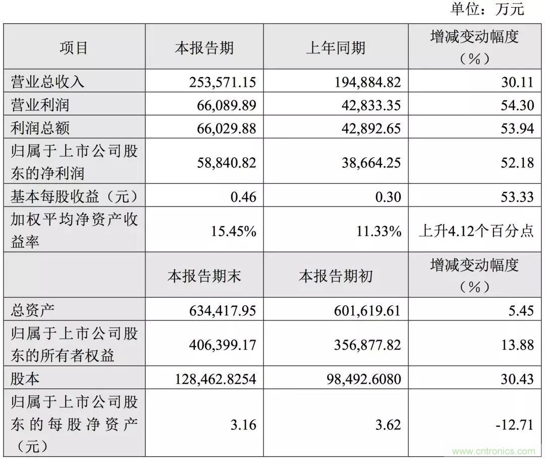 公告披露,报告期内,晶盛机电总营收为25.36亿元,同比增长30.11%;归属于上市公司股东的净利润为5.88亿元,同比增长52.18%。主要原因为随着光伏产业的发展,晶体生长设备尤其是单晶硅生长炉及智能化加工设备需求较好,报告期内验收的产品较上年同期增长;公司半导体设备销售增长较快,对报告期业绩也有积极影响。