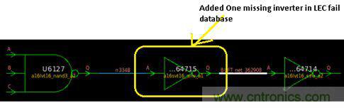 在找到LEC故障的原因后,我们必须插入一个丢失了的逆变器,并在LEC故障数据库中重做该逆变器的输入/输出逻辑连接。图3显示了新增的逆变器及其输入输出连接。现在,如果我们重新运行LEC,它将通过,非等效报告将显示零非等效点。