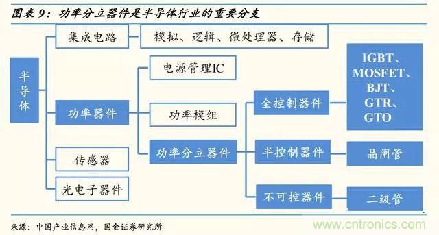 功率器件可以分为电源管理IC、功率模组和功率分立器件三大类,其中功率分立器件又可以分为全控制器件、半控制器件和不可控器件。