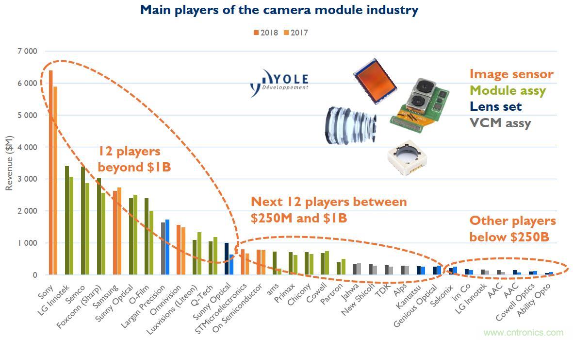 CMOS摄像头模组产业为众多厂商提供市场机会。该产业中全球排名前12位的公司每年营收均超过10亿美元,位居其后的20家公司每年营收均超过1亿美元。在过去的四年中,我们一直观察该产业,并明确了一些主要发展趋势。首先,两个重量级厂商:索尼(Sony)和大立光(Largan)分别在图像传感器和镜头领域占据主导地位,可满足市场50%的需求。但是,现在它们的统治地位受到挑战!其次,每年营收超过10亿美元的公司数量正在增长,而每年营收超过1亿美元的公司数量正在减少。这表明生态系统越来越集中化。再次,产业进入门槛变高,只有3D传感等突破性技术才能让新的厂商参与进来。最后,并购(M&A)的节奏在2017年达到了高潮,现在由于目标公司缺乏而减少了收购。