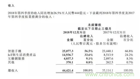 我们先按照业务线来分开看一下小米2018年业绩的表现。