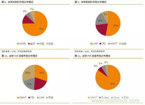 中国半导体设备国产化率低,本土半导体设备厂商市占率仅占全球份额的1-2%。17年全球半导体设备前十二大厂商(按营收排名)中包括三家美国(Applied Materials、LAM Research、KLA-Tenor)、六家日本公司(Tokyo Electron、迪恩仕、日立高新、Hitachi Kokusai、大福、Nikon)、一家荷兰公司(ASML)、一家韩国公司(SEMES),通过分析营收可知1) 行业景气度持续向上:大部分厂商17年营收增长两位数以上,其中韩国的SEMES17年同比增长142%;2) 从地域上来看,前十二大厂商10-20%比重营收来源于中国大陆,侧面说明中国半导体设备国产化率低,进口依赖程度高;并且,据SEMI统计,中国本土半导体设备厂商只占全球份额的1-2%。