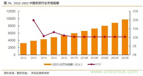 在我国经济快速发展、国内安防需求不断增长的背景下,国内安防市场发展更加迅速。2012年国内安防总产值3240亿人民币,到2017年底预计市场规模达5958亿元,六年时间市场规模增长近2倍,CAGR为11.11%,增速显著高于全球市场。2017年后国内市场增速将进入稳定期,预计未来五年保持10%左右的增速。