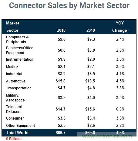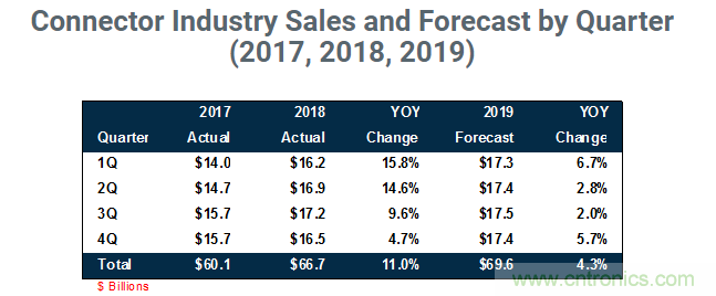 Bishop & Associates Inc.认为,连接器在2018年经历又一年增长11.0%之后,在2019年将稍作休息。预计2019年的收入将比上年增长4.3%,达到696亿美元。从区域角度来看,Bishop预计中国在2019年的增长率最高,为+6.3%,其次是亚太和北美。
