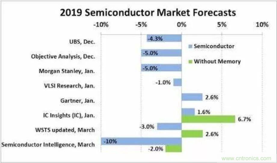 来自UBS、Morgan Stanley、WSTS、Semiconductor Intelligence等分析机构对2019年半导体市场预测分析看,大部分持负增长态度。