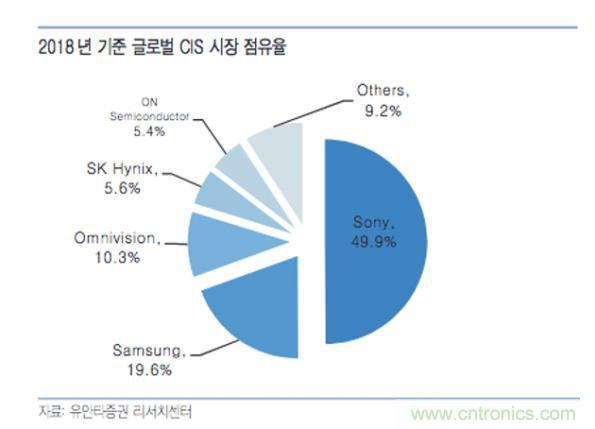 从该研究报告可以看出,2018年全球CMOS图像传感器的市场规模为137亿美元,其中,索尼的市场占有率为49.9%,排在行业第一,而且地位得到了进一步的巩固;三星排名第二,市占率为19.6%,豪威科技排名第三,市占率达到10.3%,而有些出人意料的是,SK海力士排在了第四位,安森美排在第五位。如下图所示。