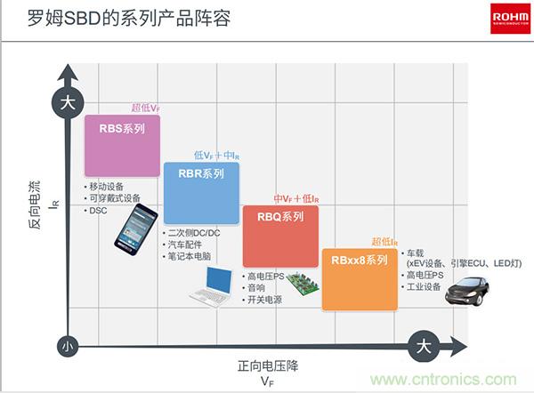 从产品种类上看,针对于小电压小电流,罗姆推出了齐纳二极管和TVS;针对小电压大电流,罗姆推出了肖特基二极管;在大电压大电流的情况下,罗姆推出了快速恢复二极管以及整流二极管;针对于600V以上的市场,罗姆则推出了以碳化硅为材料的肖特基二极管。