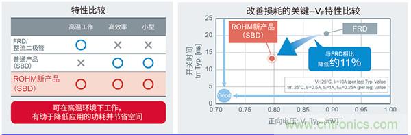 为适应上述汽车市场对SBD的要求,罗姆推出了200V耐压肖特基势垒二极管。据水原德健介绍,该款产品意在替换目前汽车市场中普遍应用的FRD。