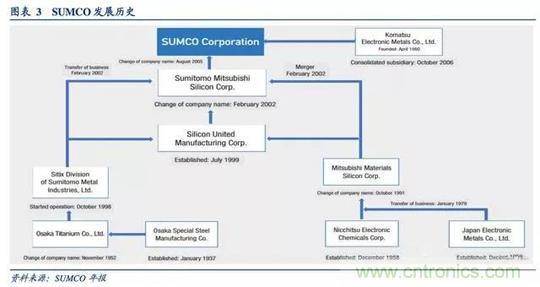 SUMCO:1952年大阪钛制造公司成立,1973年大阪钛制造公司与住友金属工业合资建立九州电子金属公司,从事硅片加工业务,引入西门子公司的区熔技术及设备,同年小松电子金属出资建立专门从事硅片加工的九州小松电子金属公司。