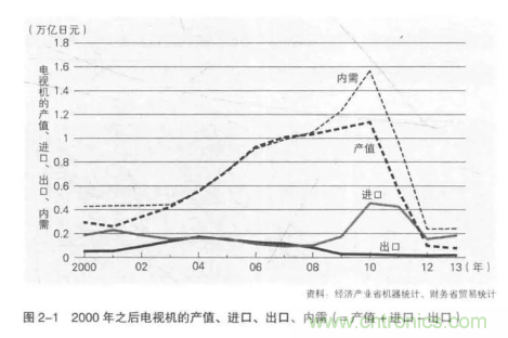 2003年,日本三大都市圈开始覆盖数字电视信号,为了接收、观看数字电视,民众产生了很强的电视机换购需求,日本电视机产业的内需和产值激增,并于2010年达到顶峰,在2011、2012年则开始骤减,并持续至今。
