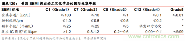 湿化学品的制备必须严格遵守国际半导体材料和设备组织(SEMI)的标准,SEMI 根据应用领域的不同制定了相应的超纯实际的要求等级,其中包含了对金属杂志、颗粒大小、颗粒个数、适应 IC 线宽范围等指标做出了规定。G1 等级属于低端产品,G2 属于中低端,G3 属于中高端产品,G4 和 G5 则属于高端产品。