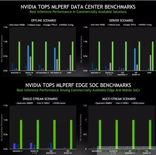 “一个完整的人工智能(AI)周期,要经历训练、推理、发出指令到设备三个过程。训练阶段在数据中心通过数据和算法创建AI,推理阶段在数据中心服务器或边缘设备的应用中使用AI。AI发展至今,已从科幻到实际应用并越来越多的影响着各行各业。”英伟达产品管理总监Paresh Kharya指出,MLPerf Inference 0.5是业界首个独立的AI推理基准测试,在所有五个衡量数据中心和边缘AI推理工作负载性能的基准测试中,英伟达均名列前茅,意味着它在取得近期AI训练基准测试领先地位的同时又更进一步。