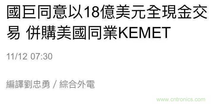 【导读】11月12日,国巨同意将以12亿美元全现金收购美资被动器件厂商KEMET。
