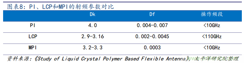 信号高频化带来的低损耗诉求。与2G/3G/4G相比,5G最明确的变化便是射频信号频率的升高。在非理想介质中传播时,信号频率越高往往意味着传输损耗越大,为了降低5G信号的传输损耗, 介电常数和损耗正切角成为天线基板材质选择时的重要考量因素,与传统的天线基板材料(塑料、玻璃或者聚酰亚胺(PI))相比, LCP和MPI(Modified PI)的介电常数和损耗正切角更符合5G信号的要求,在iPhone Xs 和 iPhone 11 Pro Max中已分别使用两者制备天线。