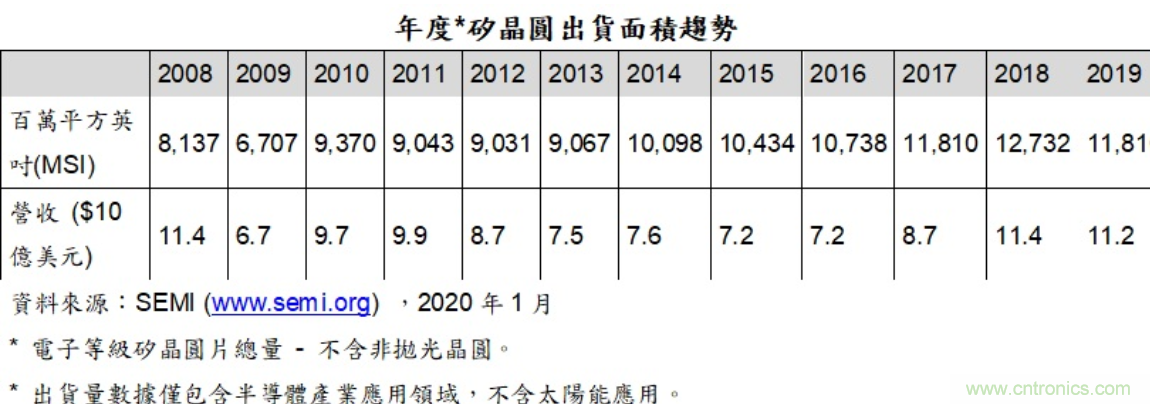 SEMI 指出,去年全球矽晶圆出货总面积为 11,810 百万平方英吋 ,较 2018 年的出货总面积 12,732 百万平方英吋下滑;去年全球矽晶圆总营收为 111.5 亿美元,低于 2018 年的 113.8 亿美元。