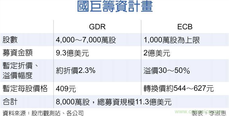 国巨2日召开临时董事会,决议海外存托凭证(GDR)暂定发行股数为4,000万股至7,000万股,并视市场状况于发行额度内调整,如依2日收盘价换算,预计可募资金额约为9.3亿美元;另在1,000万股额度下,发行ECB,发行期间五年,票面利率为0%,预计发行总额约为2亿美元,溢价幅度为30~50%。